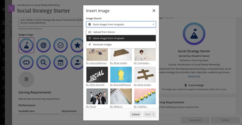Instructors now have three new options for customising Achievement badge: AI-generated images, choose from a selection of stock images from Unsplash, and manual image uploads.