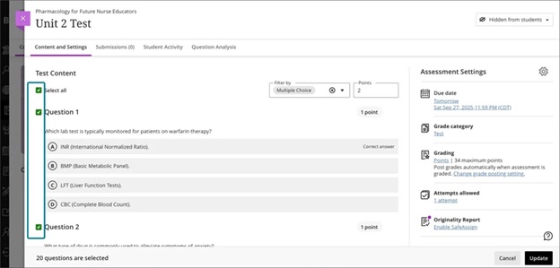 Image 2: Instructors can select the questions that they want included in the bulk edit.