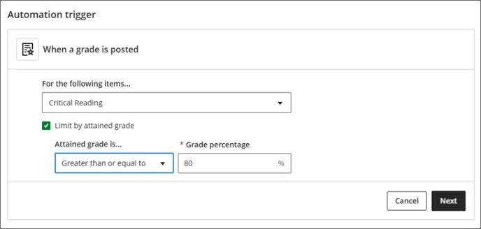 In this initial release, two automations are available. Instructors choose to either Send congratulatory message or Send supportive message. Congratulatory messages are sent when a student earns a high score; supportive messages are sent when a student does not achieve a specified score. Instructors select the grade item, set the score threshold as a percentage, and enter the message text.