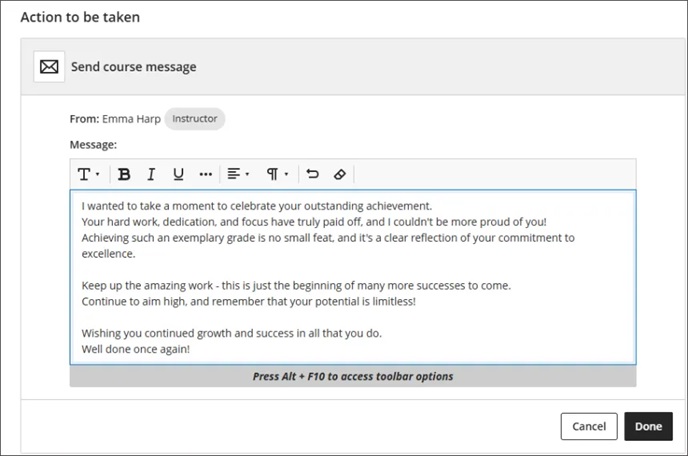 Lecturers can now create automations that send congratulatory or supportive messages to students based on custom rules set at the course level. Instructors define the score thresholds and write the messages.